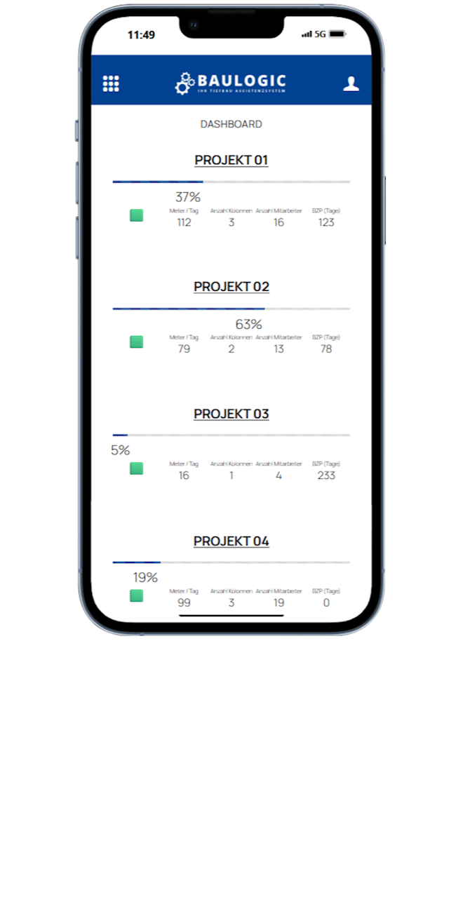 BauLogic ist keine Theorie, sondern eine praxisbewährte Lösung, die sich täglich im echten Baustellenalltag bewährt – von Großbaustellen bis kommunalen Projekten. Mit BauLogic behältst du Kontrolle über Qualität, Personal, Kommunikation und Reklamationen – alles in einer mobilen App.